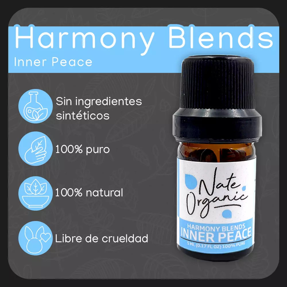 NateOrganic Nuestra mezcla “Inner Peace” de 5 ml es la solución ideal para quienes buscan encontrar la paz y la tranquilidad de manera natural. Esta combinación de aceites esenciales se obtiene a través de la destilación cuidadosa de cada uno de sus componentes, garantizando su pureza y calidad. El resultado es un aroma relajante y equilibrado que es muy popular en la aromaterapia.