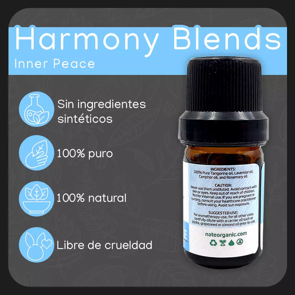 La mezcla “Inner Peace” es rica en propiedades terapéuticas. La mandarina y la lavanda son conocidas por sus efectos calmantes y relajantes, mientras que el alcanfor y el romero proporcionan equilibrio y alivio del estrés. Juntos, estos aceites esenciales trabajan en sinergia para proporcionar una experiencia de paz interior y bienestar emocional. Además, su aroma suave y envolvente ayuda a crear un ambiente sereno y reconfortante, ideal para la meditación o momentos de introspección. La mezcla “Inner Peace” es perfecta para quienes buscan reducir la ansiedad y mejorar su estado de ánimo, promoviendo una sensación de armonía y equilibrio en la vida diaria.