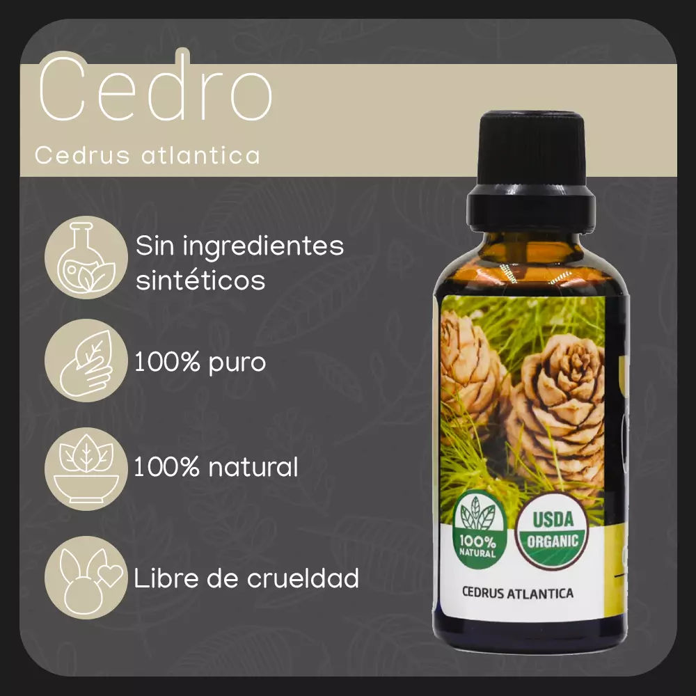 Experimenta los maravillosos beneficios del aceite esencial de cedro en nuestra presentación de 50 ml. Derivado de la madera del árbol de cedro (Cedrus atlantica), nuestro aceite esencial es de alta calidad y versatilidad, brindándote múltiples ventajas en su uso, especialmente en difusores.