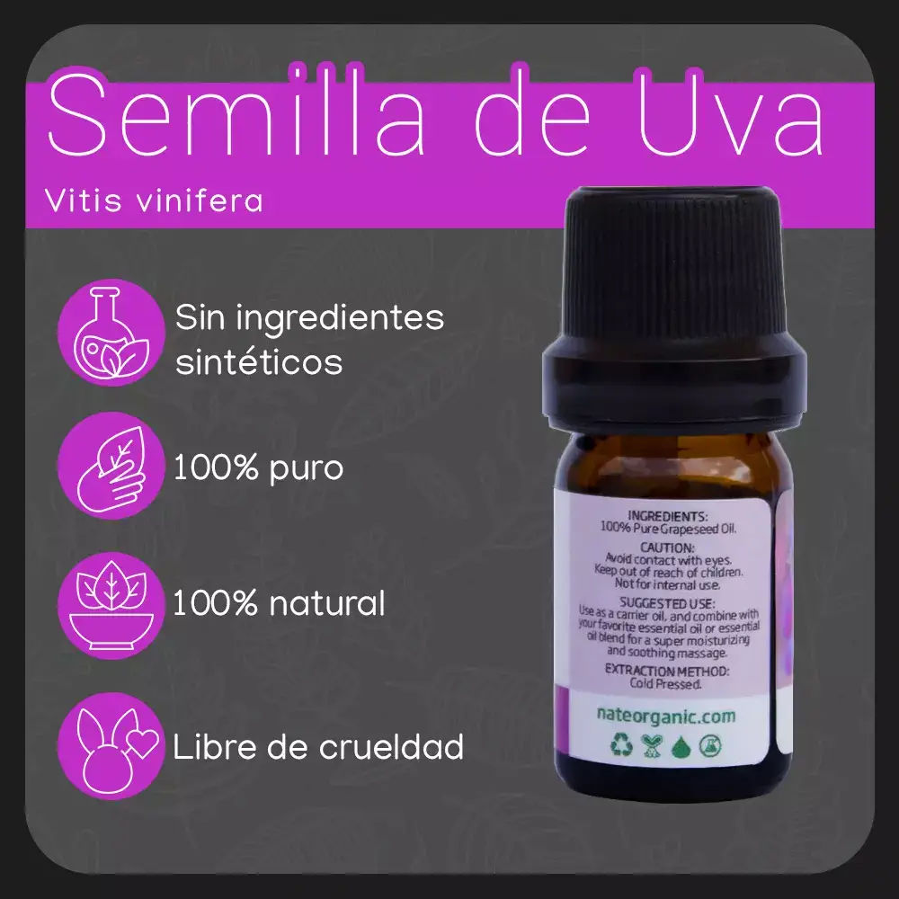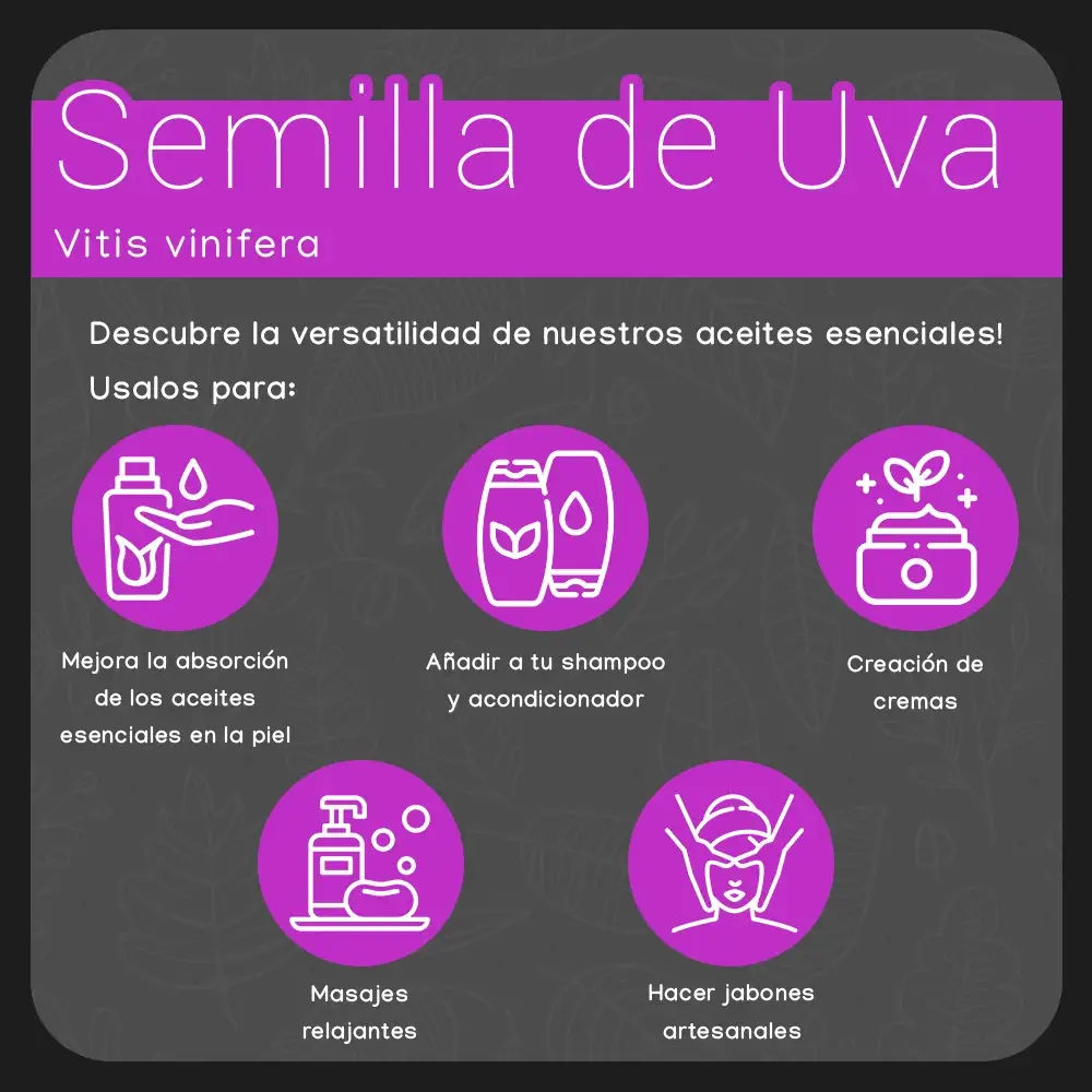 Descubre los maravillosos beneficios del aceite esencial de uva en nuestra presentación de 5 ml. Obtenido a partir de las semillas de uva (Vitis vinifera), nuestro aceite esencial de alta calidad y versatilidad te ofrece una amplia variedad de ventajas en el cuidado de la piel y el cabello.