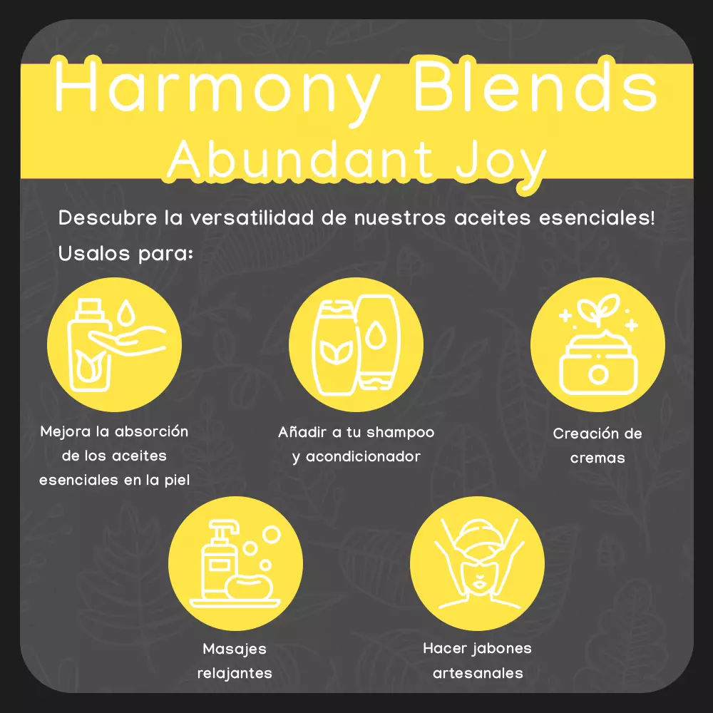 La mezcla “Abundant Joy” es comúnmente usada en aromaterapia para promover la alegría y la energía positiva. Difunde unas gotas en tu espacio favorito para crear un ambiente lleno de felicidad y entusiasmo. También puedes aplicar una pequeña cantidad diluida en un aceite portador en las sienes, la nuca y las muñecas para disfrutar de sus efectos durante todo el día. Además, puedes añadirla a tus productos de cuidado personal, como cremas, lociones y aceites de masaje, para aprovechar sus propiedades terapéuticas y promover la alegría y el bienestar en general.