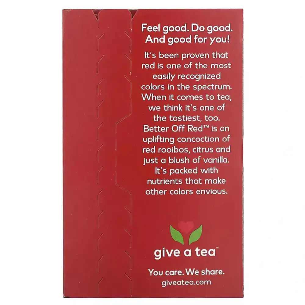 Se ha demostrado que el rojo es uno de los colores más reconocidos del espectro. Cuando se trata de té, creemos que también es uno de los más sabrosos. Better Off Red sin cafeina es una mezcla estimulante de rooibos rojos, cítricos y solo un toque de vainilla. Está repleto de nutrientes que hacen que otros colores sean envidiosos.